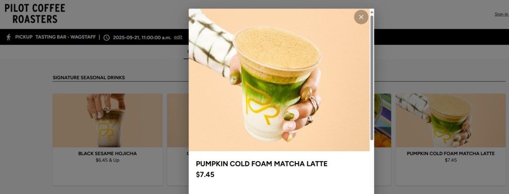 Pumpkin Cold Foam Matcha Latte at Pilot Coffee Roasters (Toronto)